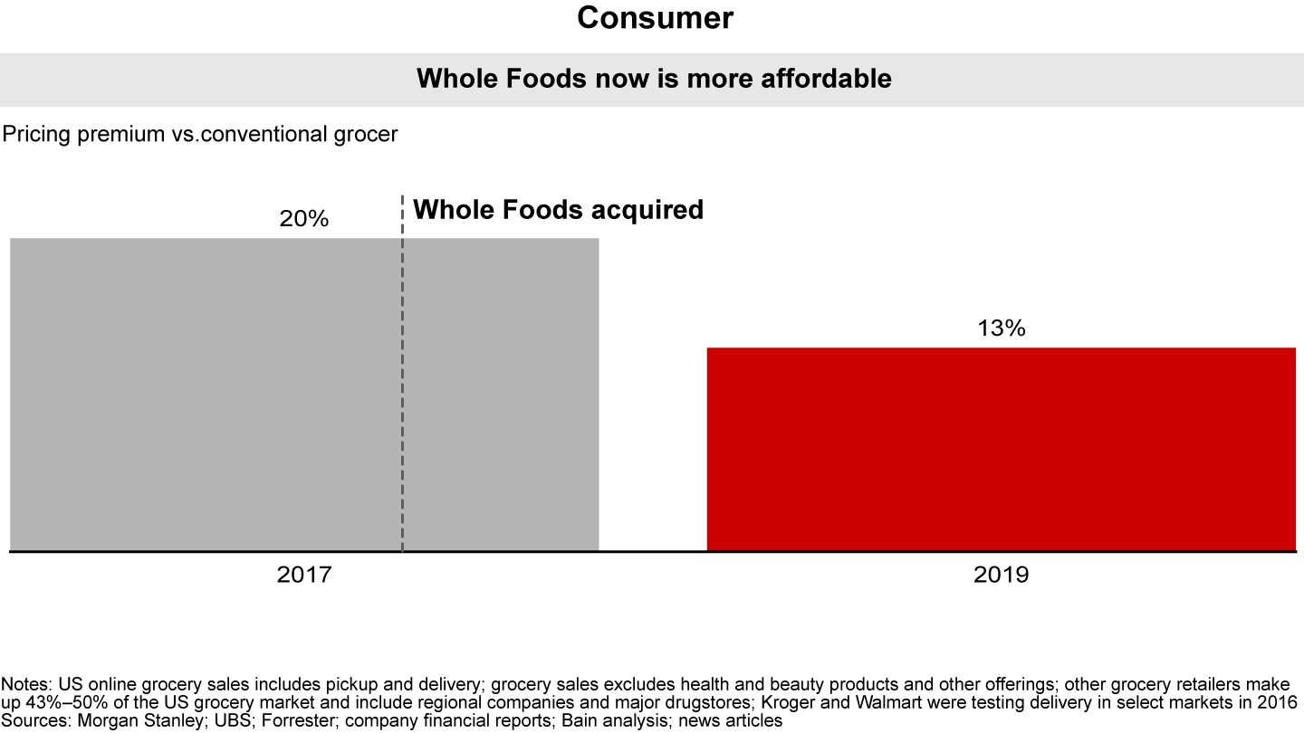 Scaling up disruptive, low-cost ideas often results in lower prices for end customers. Amazon used its efficient supply chain and buying power to shrink Whole Foods’ price premium vs. conventional grocers, making healthy, fresh food more affordable for consumers (see Figure 2).