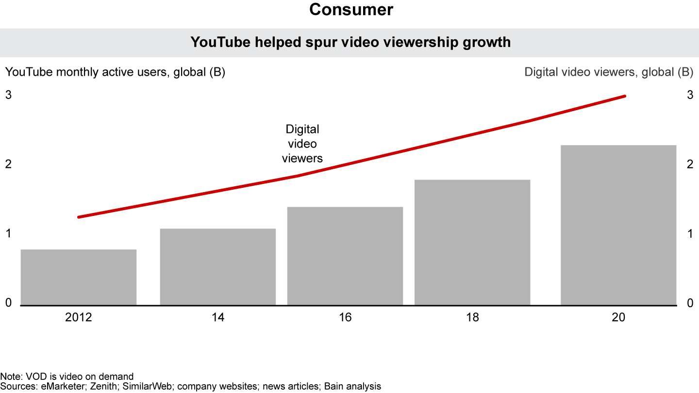 Big tech companies’ scale can also allow more people to access innovative concepts. Google catapulted YouTube onto an immense growth path that essentially created today’s digital video streaming market. Since its 2006 acquisition, streaming video has grown hand-in-hand with YouTube, expanding from about 800 million monthly active users of YouTube in 2012 to around 2.3 billion in 2020 (see Figure 3).