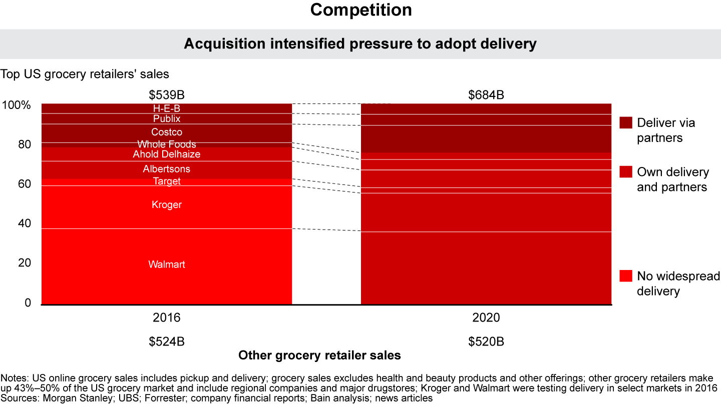 Amazon’s 2013 expansion into grocery delivery with Amazon Fresh added pressure on US grocery retailers to begin offering online ordering and delivery services, and that pressure only intensified after Amazon acquired Whole Foods. Now, every major US grocery retailer offers online ordering and delivery services, either managed in-house or via partnerships. This was true even before the Covid-19 pandemic.