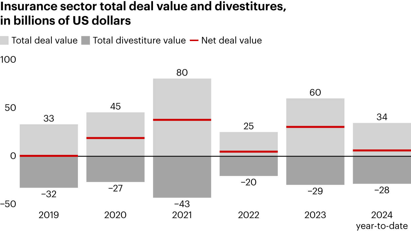 Insurance dealmaking in 2024 has been characterized by divestitures and some scale consolidation plays. Deal value rose slightly, at $77 billion by December 2024 compared with $50 billion in December 2023, even as deal volume declined to only 72 deals during the period compared with 95 for 2023.