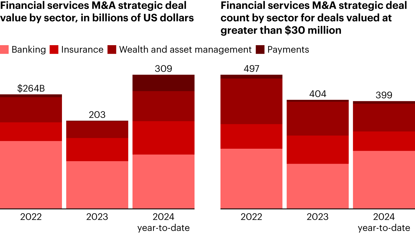 Technology, regulation, and shifting customer demands conspired to drive executives in the financial services arena back into the M&A market during 2024. Banks needed to get bigger—fast. Insurers divested their way out of troubled positions. Payments companies acquired for an edge in technology-driven scope deals. Wealth and asset managers sought deals that moved them into the territory of alternative asset managers, which were pursuing their own deals to build scale.