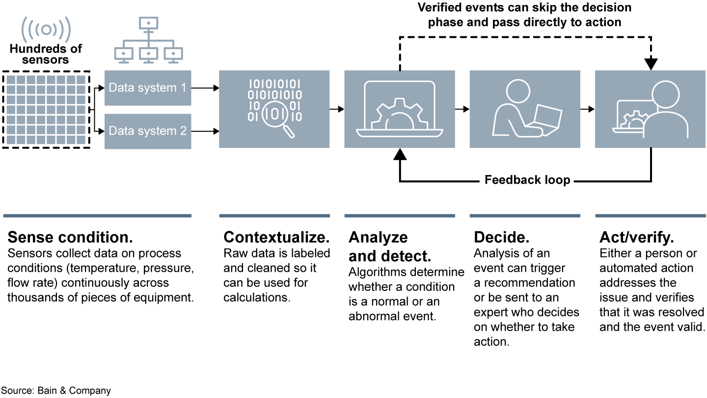 One of these is event-driven reliability, a stepping-stone toward predictive maintenance that helps companies digitally monitor their assets and guard against the risk of failure and lost production. Event-driven reliability taps existing process controls and sensors (for example, temperature, flow rate and pressure) across disparate information sources to determine whether equipment is operating outside of normal conditions (see Figure 1). It builds off traditional condition-based monitoring by using advanced analytics and new workflow tools to generate real-time, targeted insights about future performance. Abnormal conditions trigger events like an automated action (for example, sending out a work request or stopping a process) or a notification to an expert who can decide what action to take.