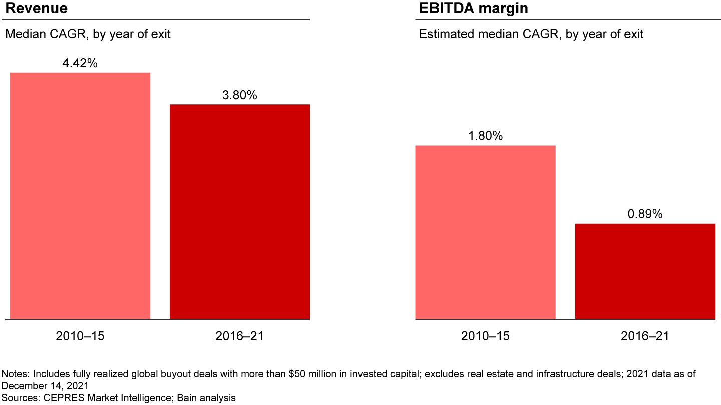 The imbalance owes much to the steady tailwind provided by rising asset multiples, which can allow general partners (GPs) to buy a portfolio company and see an increase in value even if little has changed in its operational performance. Something else is going on as well: Buyout investors on average have actually become less adept at improving the performance of their portfolio companies. Comparing those same five-year periods, CEPRES data shows that revenue and margin growth among buyout companies have fallen 14% and 51%, respectively (see Figure 3). For the past decade, then, private equity funds have not only developed an outsize reliance on multiple expansion to generate returns, but they have also lost ground when it comes to adding organic value.