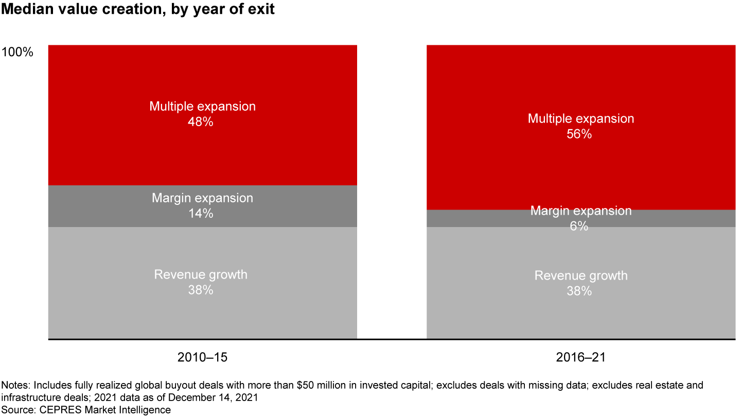 Breaking this question down starts with a deal-by-deal analysis to understand what factors are most responsible for returns. It’s a valuable exercise at any time, but especially amid the threat of rising rates. Firms need clear visibility into two things: How much has the general buoyancy of asset prices contributed to returns, and how much has come from boosting revenue growth or improving margins? In other words, if rising rates flatten multiples, where would that leave you in terms of generating differentiated returns?