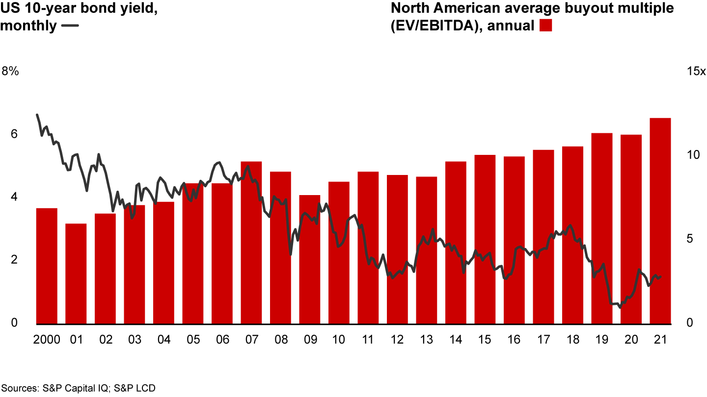 Consider the last 20 years of interest rate movements. While the 10-year Treasury yield has dropped from 6.0% in 2000 to around 1.5% today, the average leveraged buyout multiple has jumped to 12.3 times earnings before interest, taxes, depreciation, and amortization (EBITDA), from 6.8x in 2000—a 1.8-fold increase (see Figure 1).