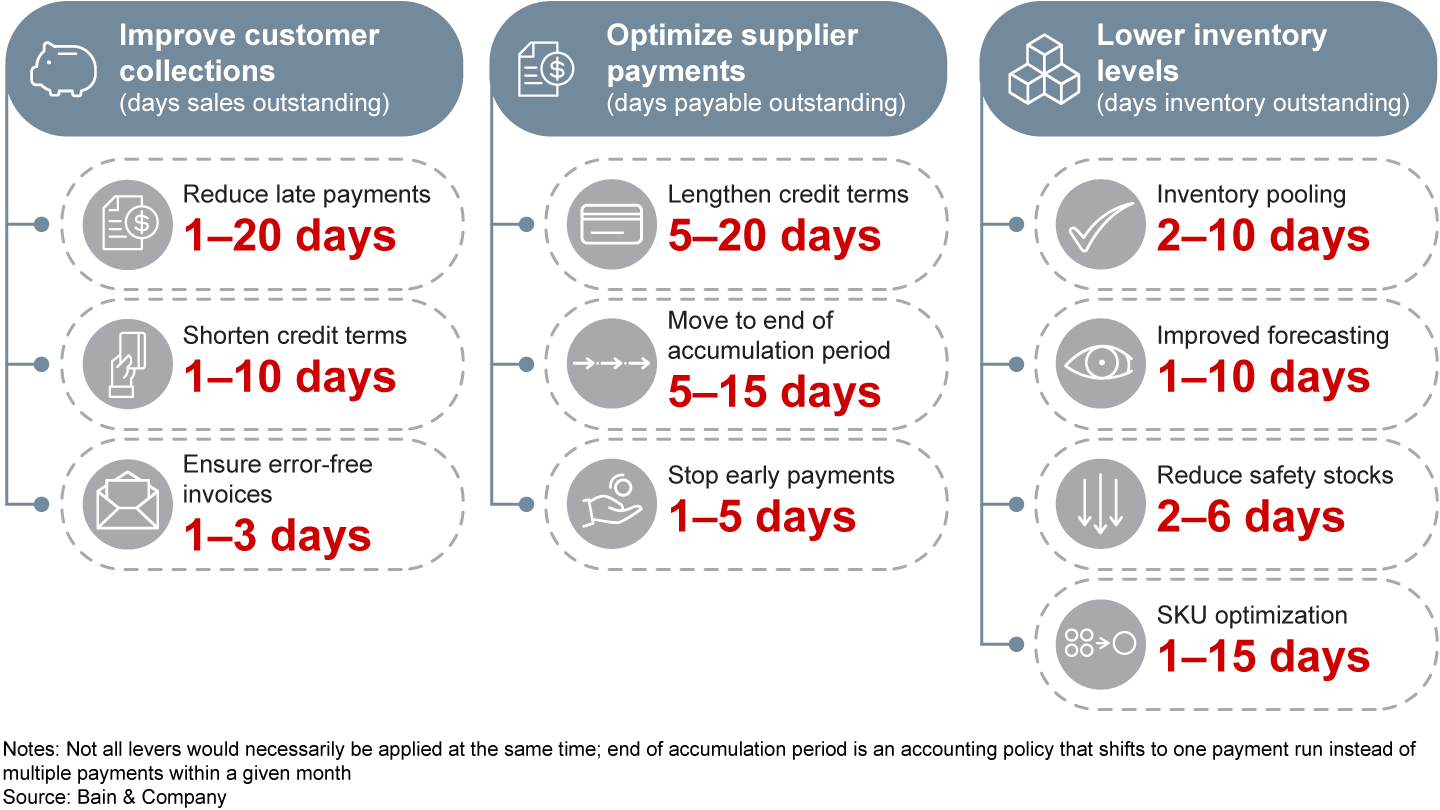 Cash flow management takes a central role in this crisis. Under normal business conditions, companies spend most of their time on the profit and loss statement. Now, finance should encourage the business to emphasize cash flow and the balance sheet. Finance should focus on expediting receivables, extending payables where appropriate and more tightly managing inventory (see Figure 1). For some companies, that may mean immediately launching a net working capital optimization program to shorten the cash conversion cycle.