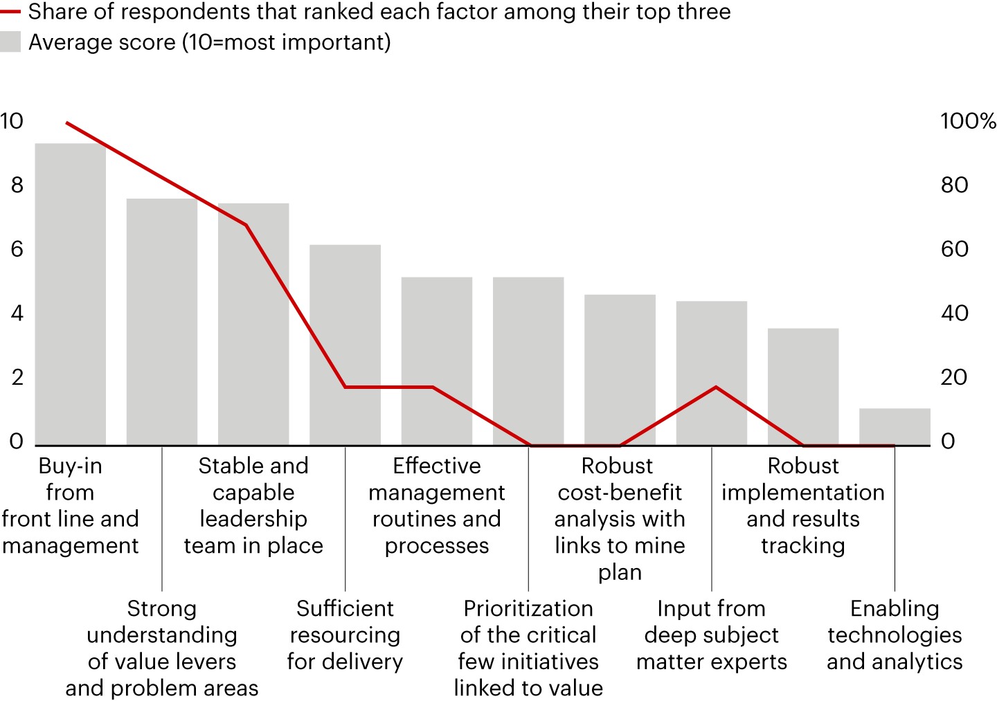Mining leaders know what delivers operational excellence. Bain recently asked a select group of executives from the industry’s largest and most respected companies to rank the factors most critical to a successful site-based improvement program. Together, these companies represent around $300 billion in market value (as of this writing) across a diverse range of bulk commodities, base metals, and precious metals. The individuals surveyed bring deep operational experience across site leadership, business improvement, and executive roles. Their responses weren’t all that surprising. Three tried-and-true ingredients rose to the top: buy-in across the organization; a strong understanding of what delivers value; and stable, capable leadership (see Figure 1). Most of the group also cited sufficient resourcing, effective management processes, and a sharp focus on a crucial short list of initiatives that pull the highest-value levers.