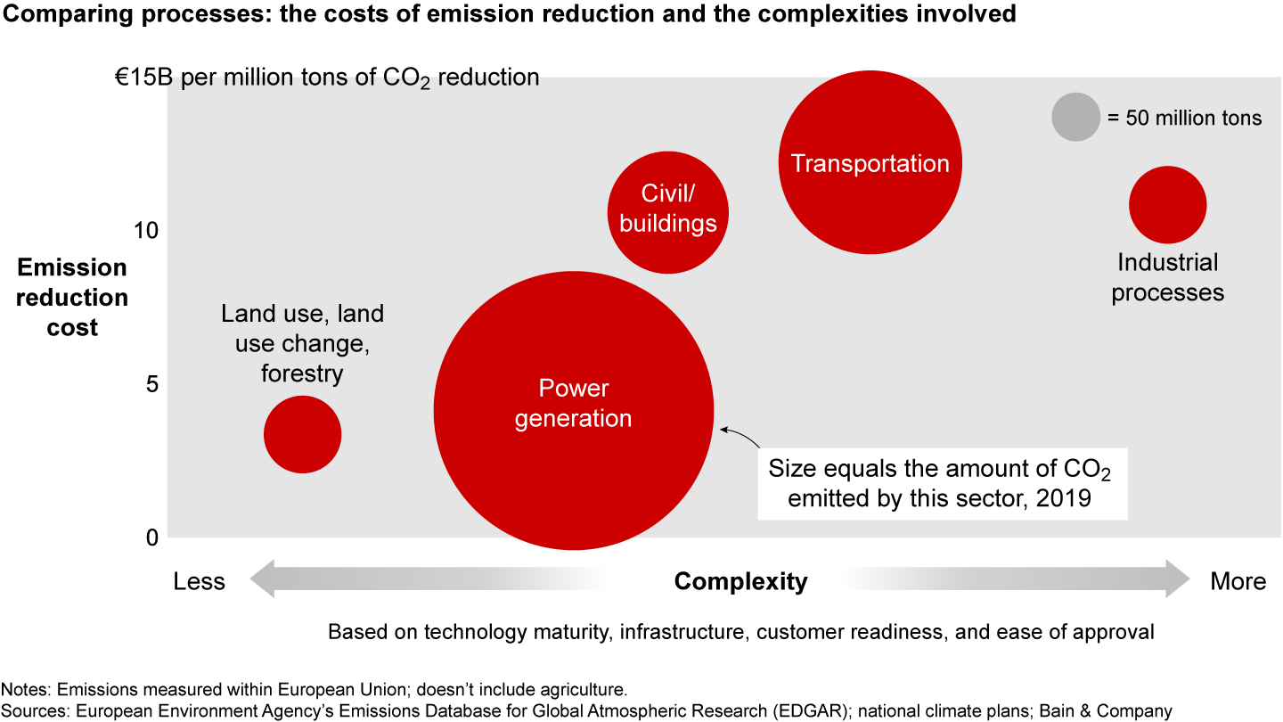 Much of the discussion on reducing emissions focuses on abatement curves and net-zero studies. While these help countries and industries think about where they have to go, getting there has more to do with encouraging capital and reducing risk. A look at nonagricultural emissions in the European Union through the lens of capital intensity and complexity shows where some of the big opportunities are, and where the private sector probably needs more support to reduce the risk of large investments (see Figure 1). In some sectors, such as power generation, the technology to reduce emissions is already well known, and the required capital investment is within reach for much of the private sector, given the right policy constructs and pricing mechanisms. However, in other sectors, where the complexity and costs remain high, such as transportation and industrial processes, managing risks will require public and private partnerships.