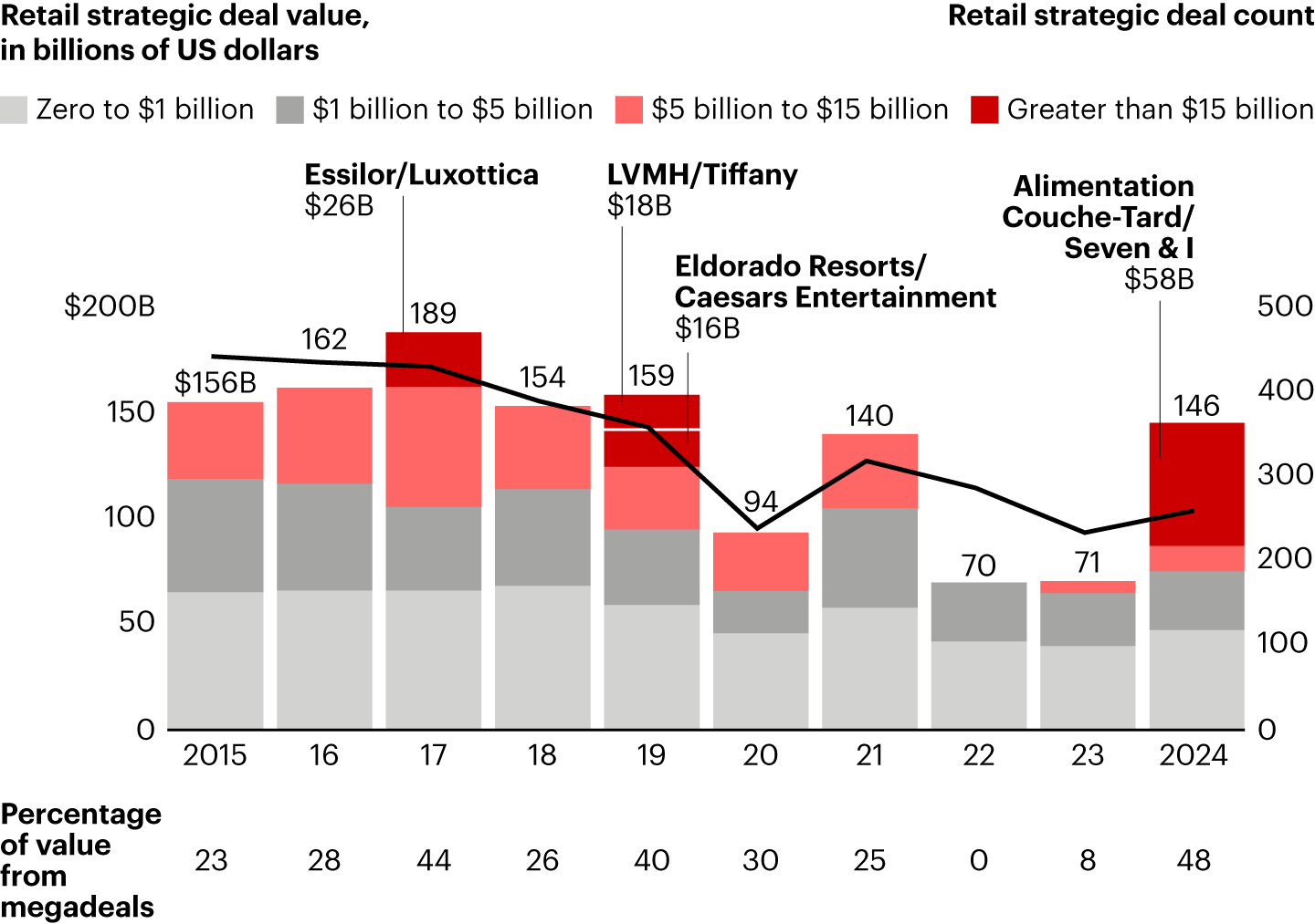 Deal value doubled in 2024 while median valuations increased from 9 times to 10 times. But keep in mind that almost 85% of the value increase was represented by one megadeal announcement: the $47 billion ($58 billion including debt) Alimentation Couche-Tard (ACT) bid for Seven & I (see Figure 1). In retail, megadeals worth more than $5 billion have accounted for more than 25% of deal value in four of the past six years.