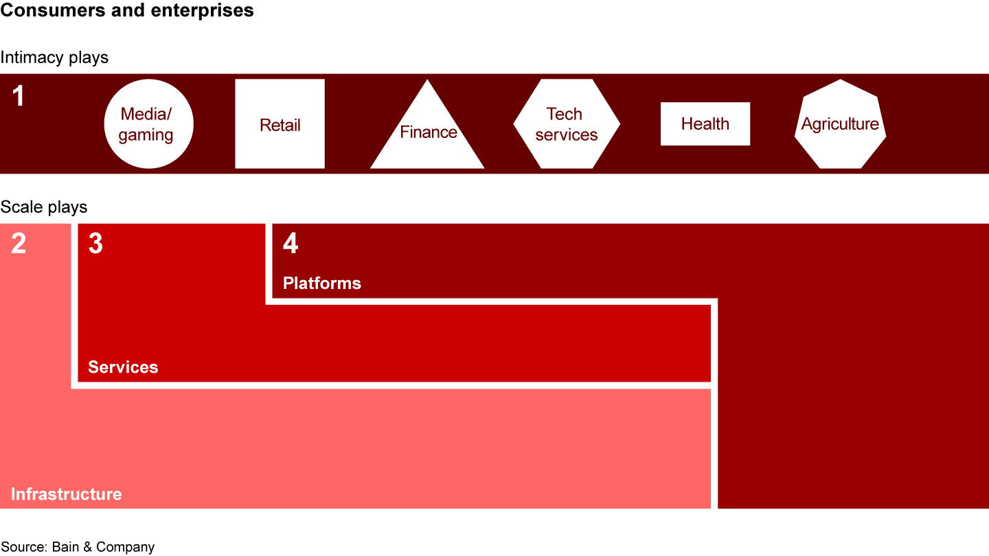 The traditional integrated telco model has started evolving into four distinct competitive arenas, each with diverse business model options: infrastructure, services (for both consumers and enterprises), platforms, and “customer intimacy” plays (nimble businesses that are focused on specific industry verticals or customer needs and leverage capabilities that can be sourced from platform companies) (see Figure 1).