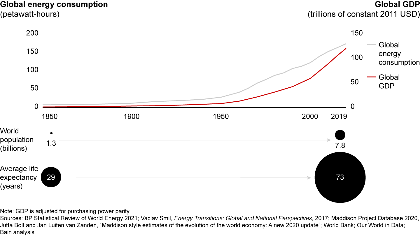 Global energy use has always grown with the population and GDP