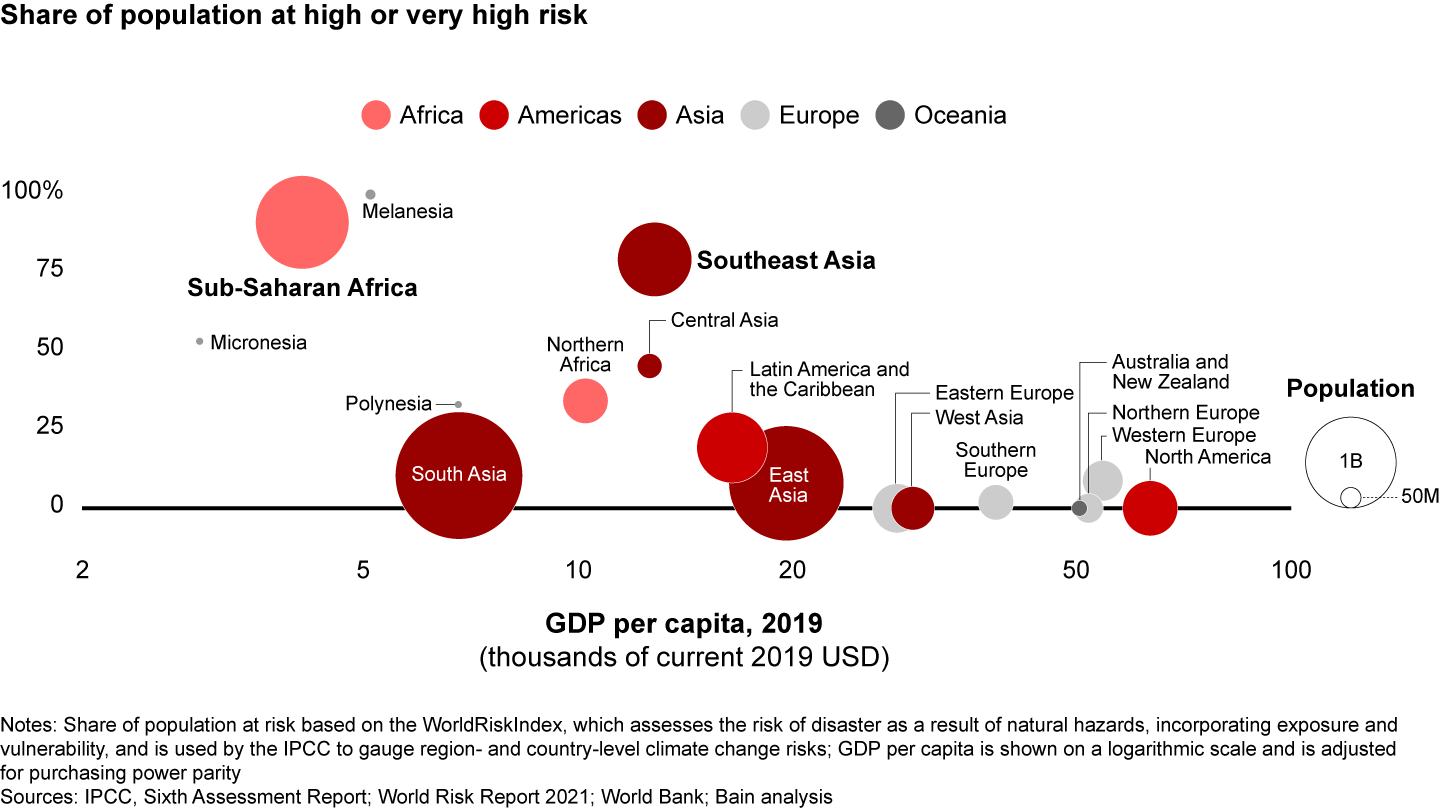 Future climate change risk varies considerably by region, with Southeast Asia and sub-Saharan Africa disproportionately exposed