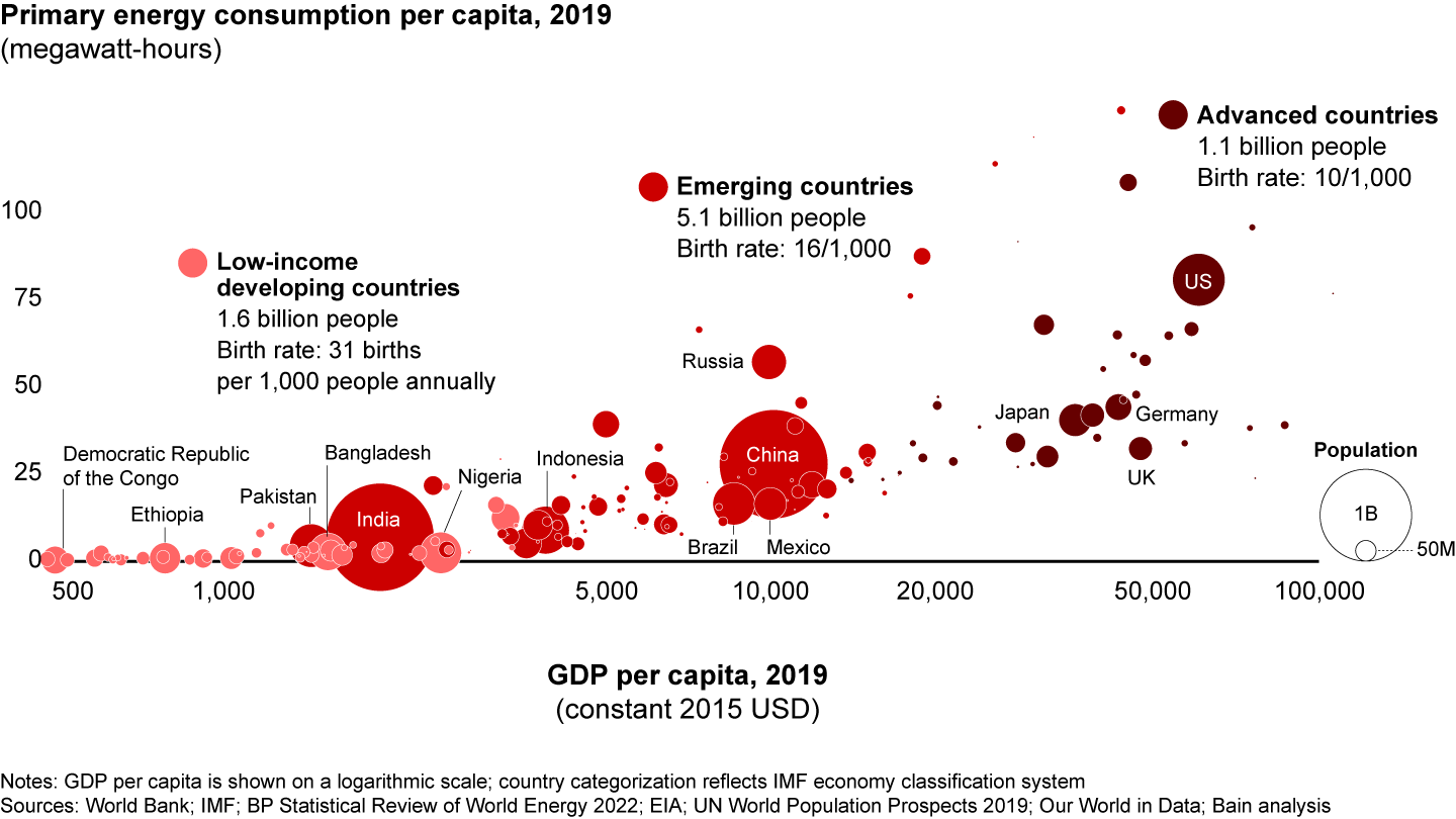Efficiency gains, including from electrification and increased renewable energy use, will offset some of the future demand. So far, however, only advanced economies comprising a minority of the global population have decoupled economic growth from energy consumption (see Figure 4).