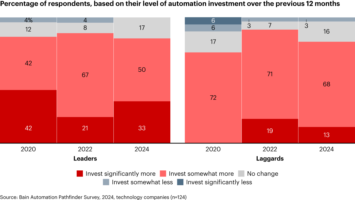 Bain’s latest survey of 893 automation executives worldwide, including 124 in technology companies, finds that companies investing most heavily in automation outperform laggards in savings achieved and adoption of new, more disruptive technologies. (We define leaders as companies investing at least 20% of their IT budget in automation in the past two years, and this elite group achieved an average 22% in cost savings. Laggards are companies investing less than 5% of their IT budget in automation, and these firms achieved just under 8% in savings on average.)