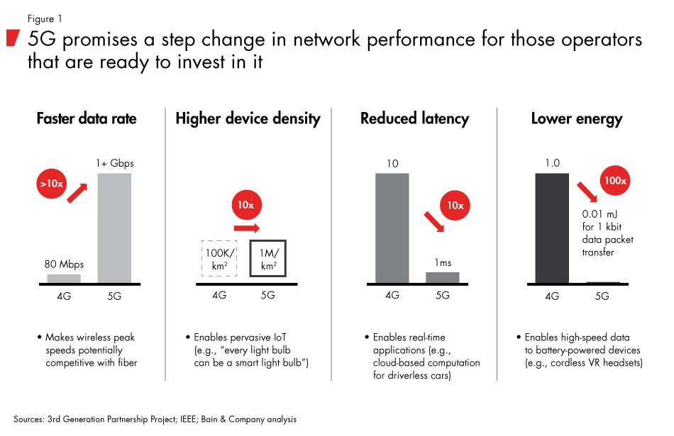 With 5G, network operators can offer the 1-gigabit-per-second speeds and 1-millisecond latencies needed to challenge fixed-line providers with fiber-to-the-premises broadband Internet in denser markets. This is well beyond what is possible with 4G, where speeds of 80 megabits per second (Mbps) and latencies of 10 milliseconds (ms) make it impossible to provide a true substitute for fixed-line service.